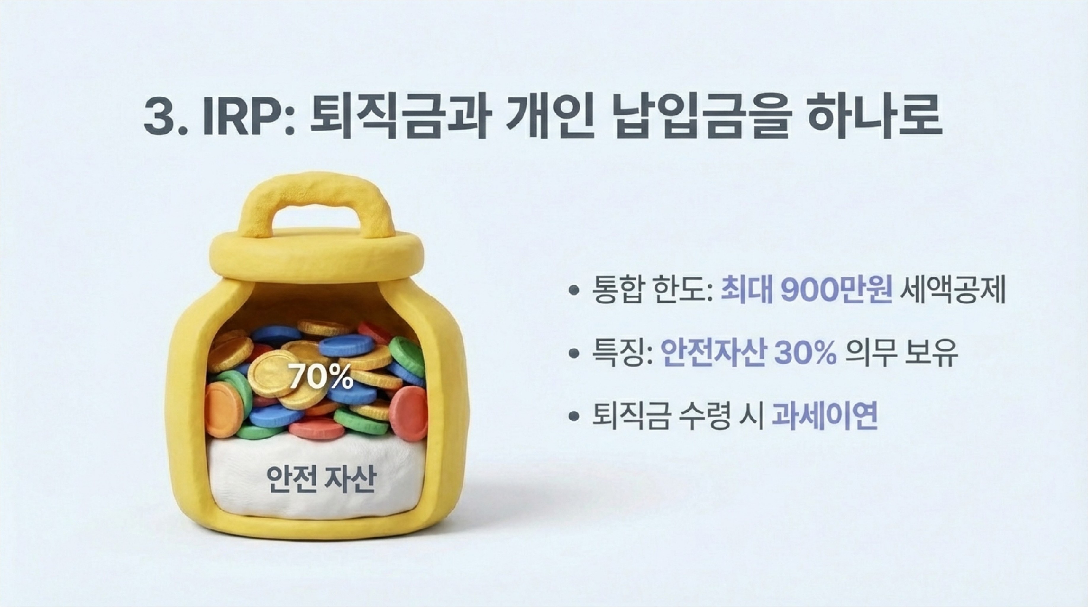 - IRP (개인형 퇴직연금) - 든든한 안전장치: 퇴직금과 개인 납입금을 하나로 관리하는 계좌입니다. 연금저축과 합산하여 최대 900만 원까지 세액공제를 받을 수 있으며, 30%는 의무적으로 안전자산에 투자해야 합니다. 퇴직금을 수령할 때 과세이연 효과도 누릴 수 있습니다.