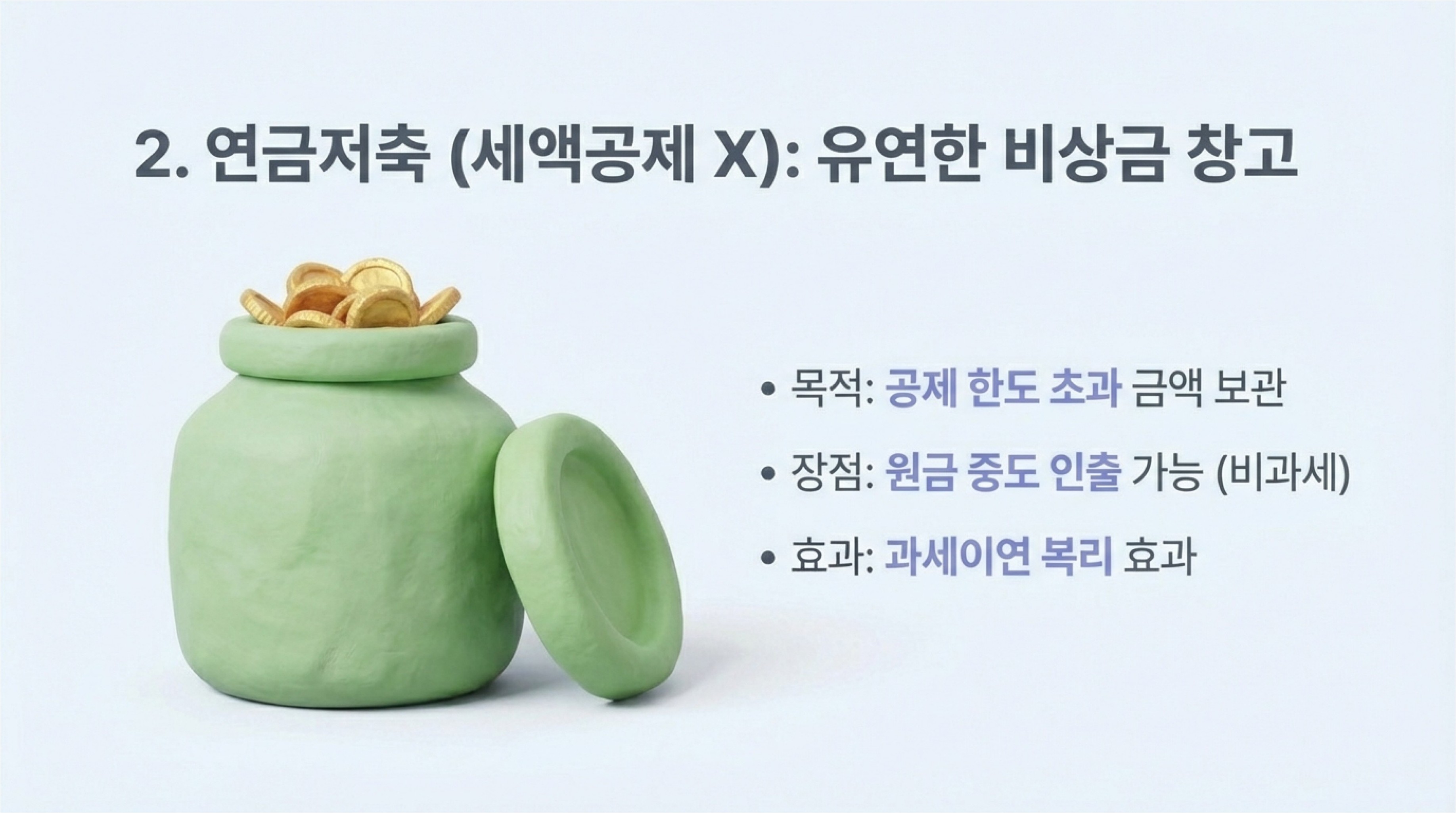 - 연금저축 (세액공제 X) - 유연한 비상금 창고: 공제 한도를 초과한 금액을 보관하는 용도입니다. 과세이연 복리 효과를 누리면서도, 납입 원금은 언제든 비과세로 중도 인출할 수 있어 든든한 비상금 창고 역할을 합니다.
