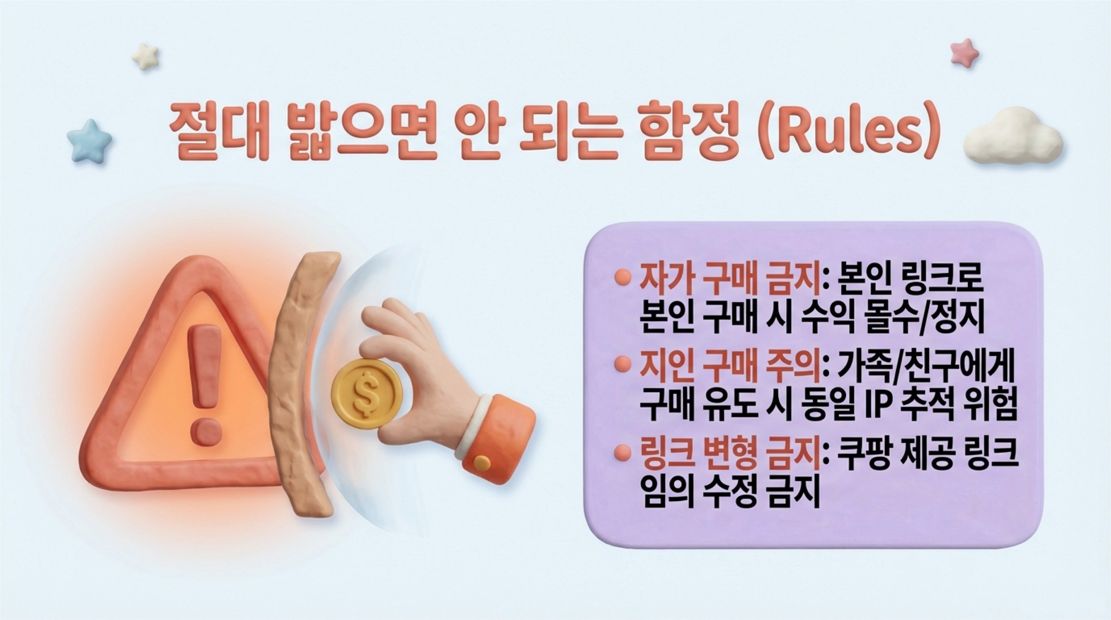 본인의 링크로 본인이 구매하는 '자가 구매'는 절대 금지입니다. 또한 가족이나 친구에게 구매를 유도할 경우, 동일 IP 추적으로 인해 부정행위로 간주될 위험이 있으니 주의해야 합니다. 쿠팡에서 제공한 링크를 임의로 수정하는 것 역시 금지되어 있습니다.