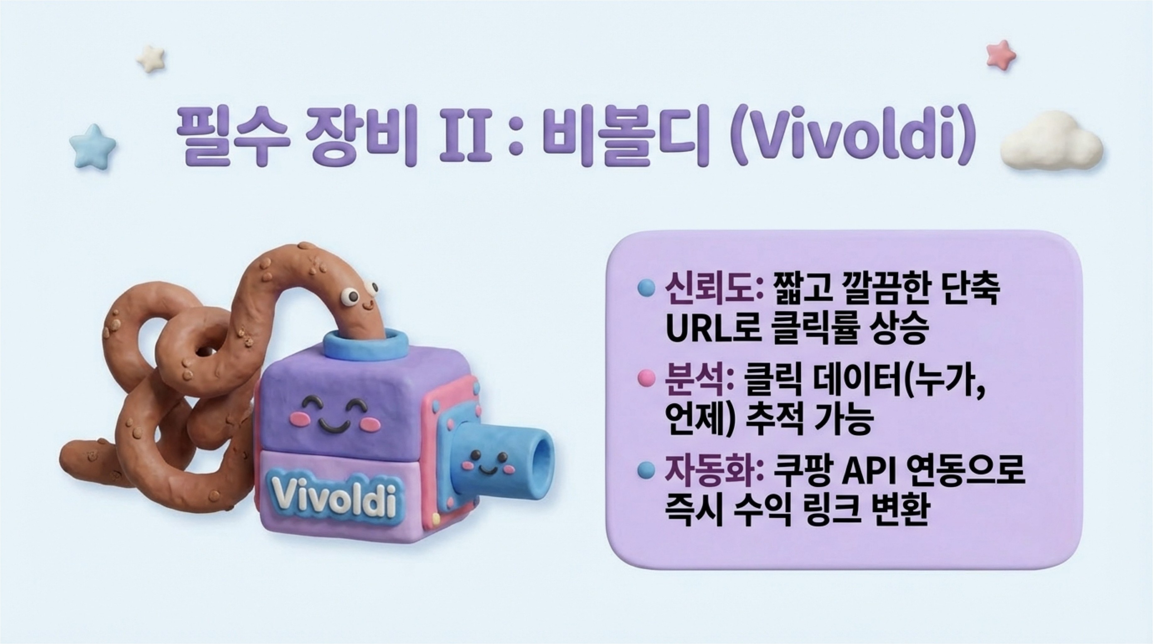 유튜브 프로필에는 링크가 하나만 보인다는 문제점을 해결해 줍니다. 여러 상품을 한 페이지에 모아주는 '멀티링크' 서비스로, '한 줄 공지' 기능을 활용해 대가성 문구를 최상단에 고정하는 꿀팁도 잊지 마세요. - 필수 장비 2: 비볼디 (Vivoldi)