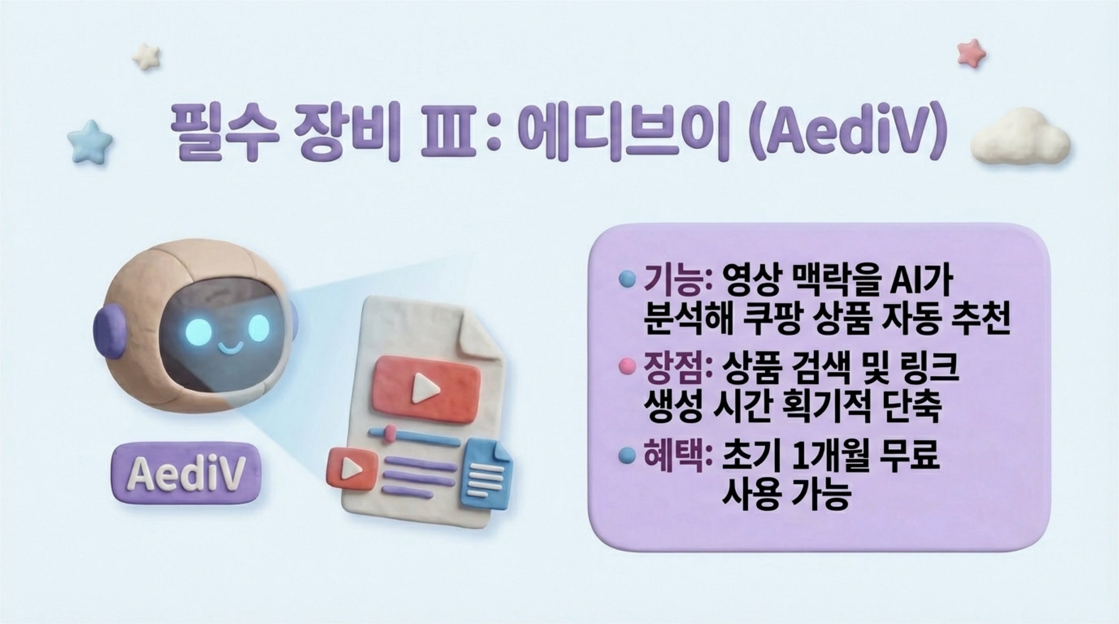 길고 지저분한 쿠팡 링크를 짧고 깔끔한 단축 URL로 바꿔주어 클릭률을 상승시킵니다. 누가, 언제 클릭했는지 데이터 추적이 가능하며, 쿠팡 API 연동을 통해 즉시 수익 링크로 변환해 주는 자동화 기능도 갖추고 있습니다. - 필수 장비 3: 에디브이 (AediV)