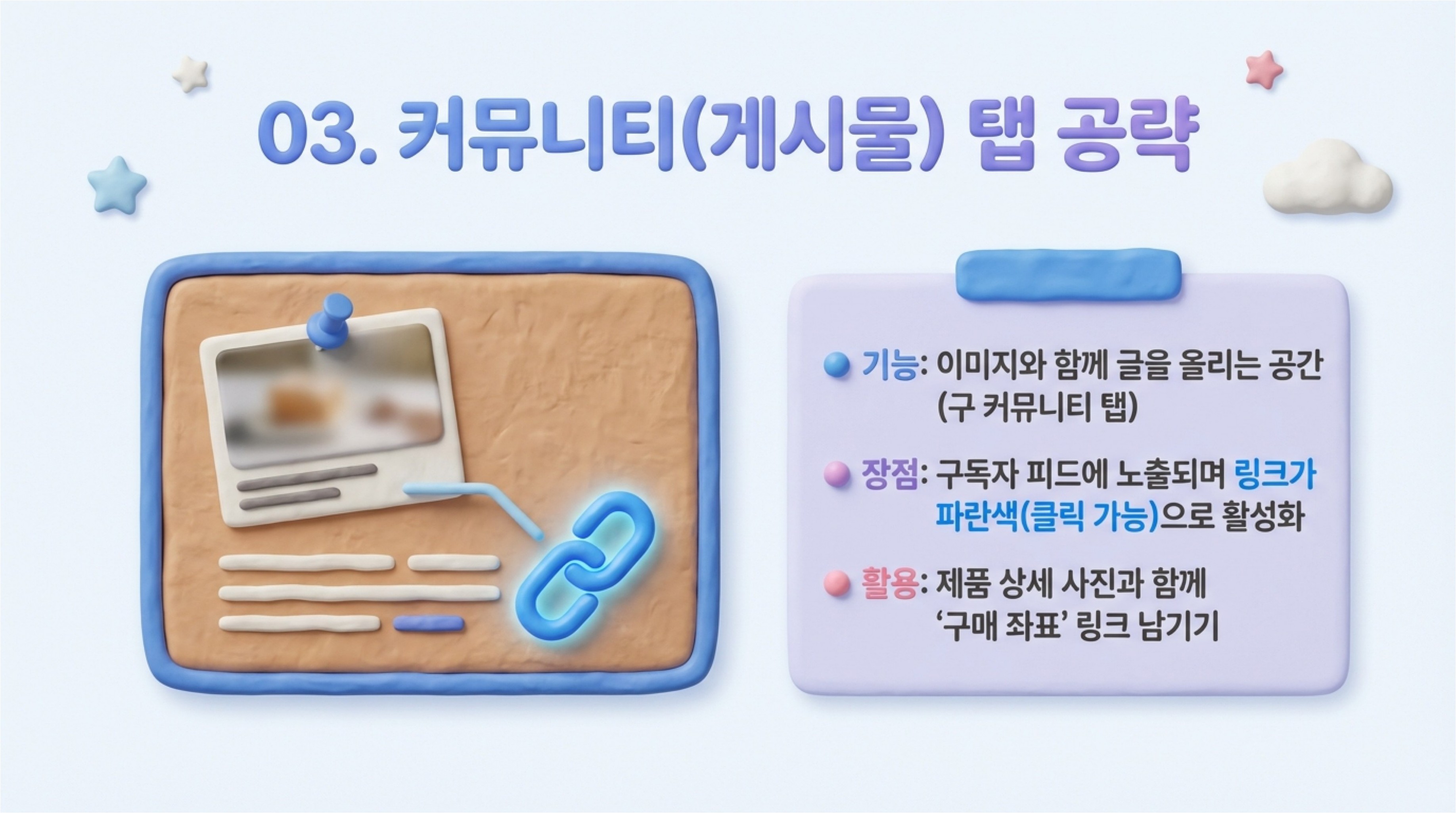 예전 커뮤니티 탭이었던 게시물 기능은 이미지와 함께 글을 올릴 수 있는 훌륭한 공간입니다. 구독자들의 피드에 자연스럽게 노출되며, 링크가 파란색으로 클릭 가능하게 활성화된다는 장점이 있습니다. 제품의 상세 사진과 함께 '구매 좌표(링크)'를 남겨보세요.
